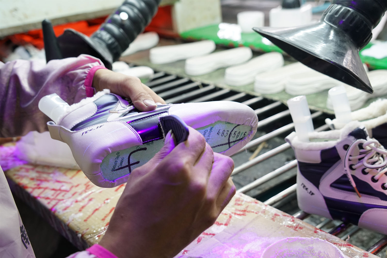 記者來到制鞋車間內(nèi),工人們正熱火朝天地忙碌著。記者在現(xiàn)場看到,在刷膠這道工序中,工人們都在一個集氣罩下進行操作。